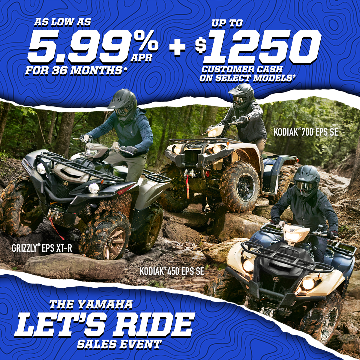 * Offer available on approved purchases of new 2023 – 2026 Yamaha ATV made on the Yamaha Credit Card issued by WebBank. Offer valid 7/1/2025 – 9/30/2025. Account must be open and current to be eligible for this offer. Promotional 5.99%, 7.99%, 14.49%, 21.99% APR financing with minimum payments of 3.05%, 3.14%, 3.45%, or 3.82% are effective until the purchase is paid in full. Minimum interest charge $2 per month. Promotional rates are based on creditworthiness. Not all applicants will qualify.