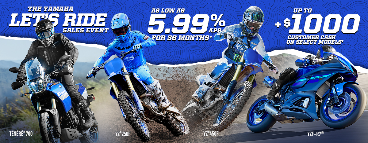 * Offer available on approved purchases of new 2023 – 2026 Yamaha Motorcycle made on the Yamaha Credit Card issued by WebBank. Offer valid 7/1/2025 – 9/30/2025. Account must be open and current to be eligible for this offer. Promotional 5.99%, 7.99%, 14.49%, 21.99% APR financing with minimum payments of 3.05%, 3.14%, 3.45%, or 3.82% are effective until the purchase is paid in full. Minimum interest charge $2 per month. Promotional rates are based on creditworthiness. Not all applicants will qualify.